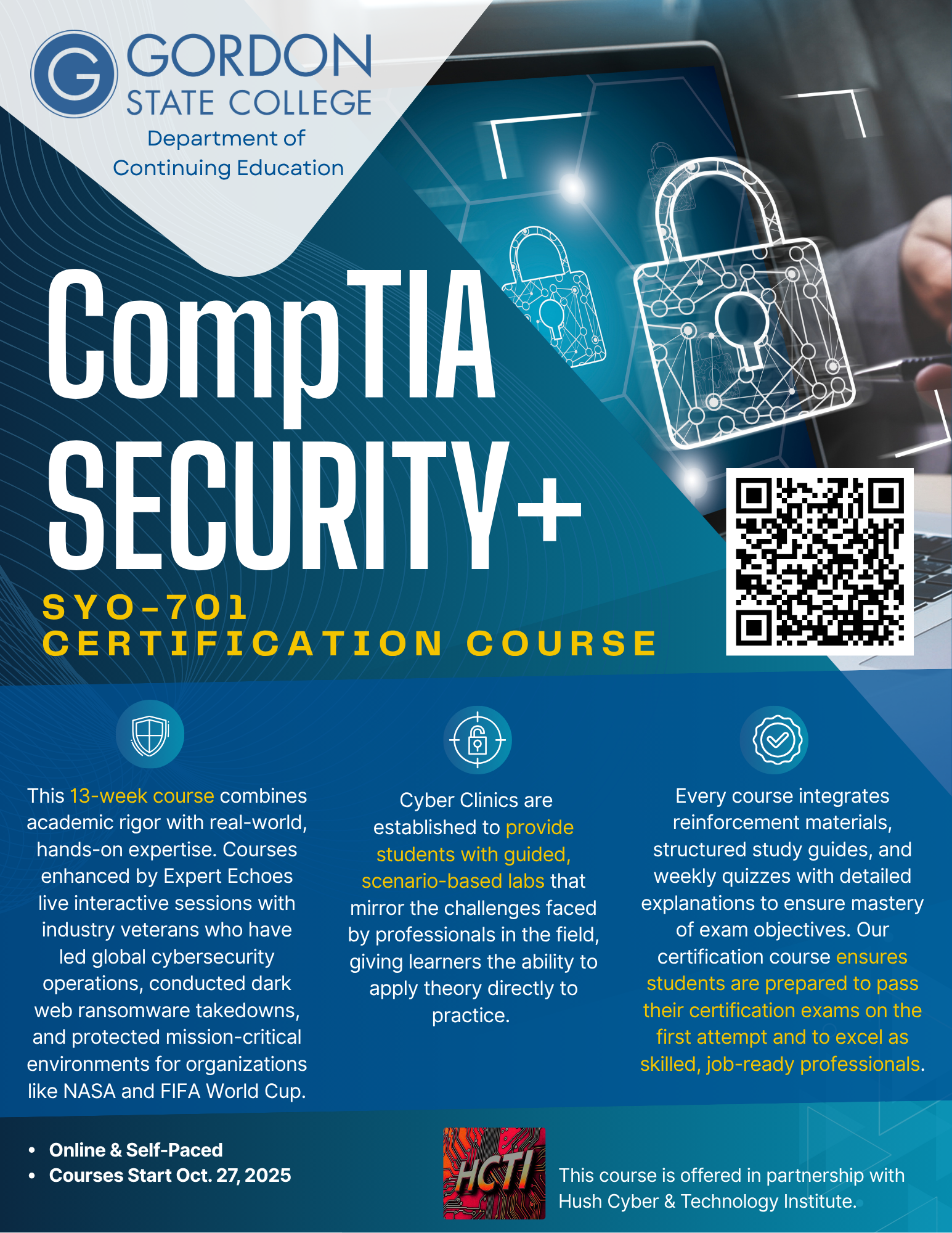 Upon completion, students will be fully prepared to sit for the CompTIA Security+ certification exam (SY0-701) — an industry-recognized credential aligned with DoD 8570/8140 requirements and widely regarded as the baseline certification for cybersecurity professionals in both public and private sectors.