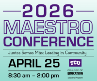Our third annual MAESTRO conference will take place 9:00 am - 2:00 pm on April 25, 2026 in the Dee J Kelly Alumni and Visitors Center. The theme of this year’s conference is Juntos Somos Más: Leading in Community. The TCU College of Education MAESTRO program seeks to recruit and sustain a community-represented workforce for K-12 teaching positions. It supports TCU students interested in pursuing a career in education and becoming leaders within their community.
